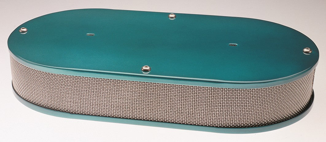 Single Oval Flame Arresstor for Dominator style carbs. 3 inch height element with 1 inch riser lip overall measures 4 inch. Stainless steel. High quality. 18 3/4 inch length by 10 inch width. Custom colors available on special order basis.