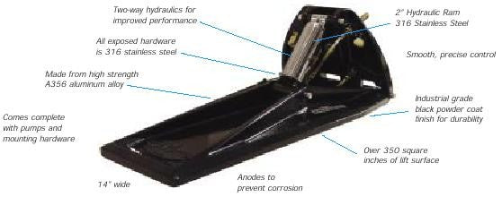 A heavily built true offshore trim tab. Cast tab is powder coated in a durable black finish. Tabs are 14 x 28 and come complete with braided exterior ram hoses and stainless steel cylinders. This is one tough tab.